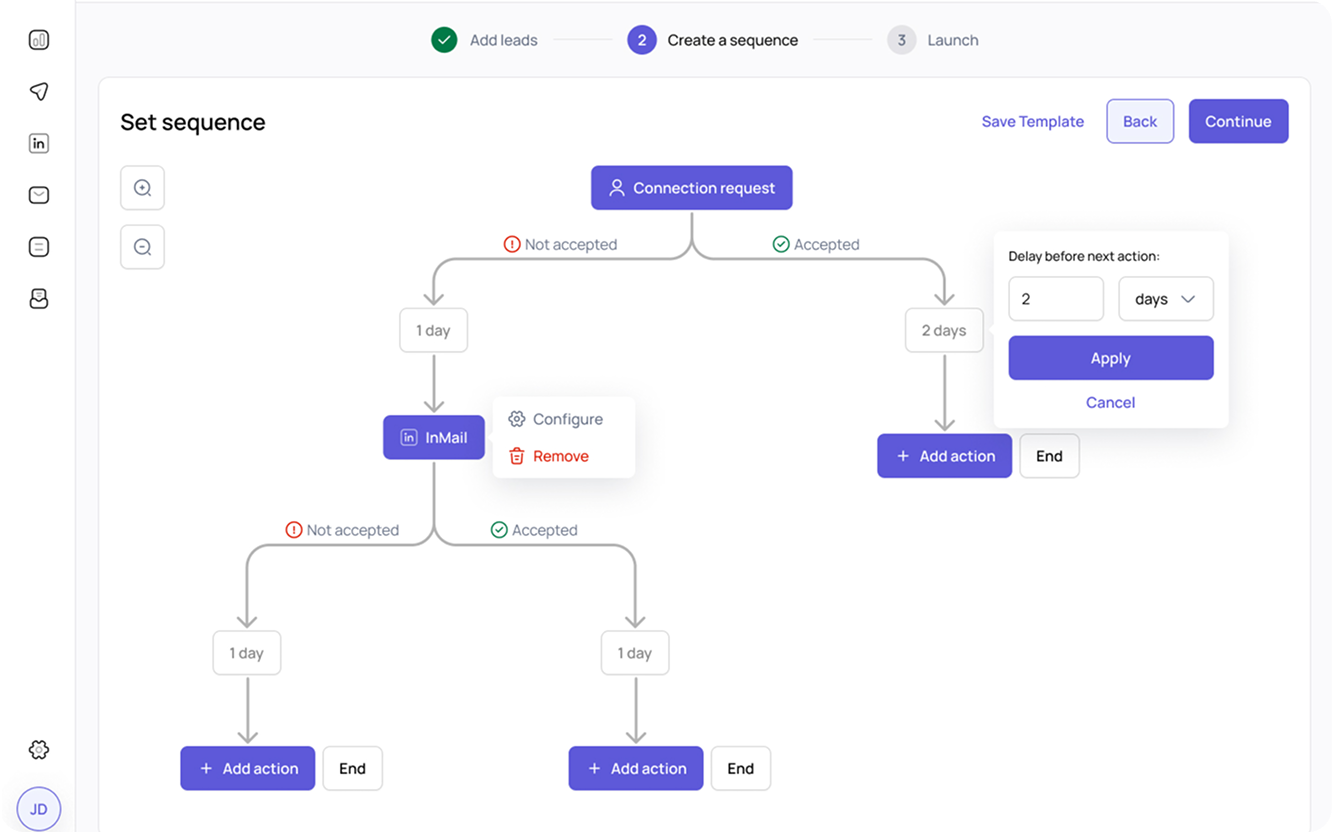 Build smart drip campaigns with customizable LinkedIn and email steps, delays, and conditional triggers.
