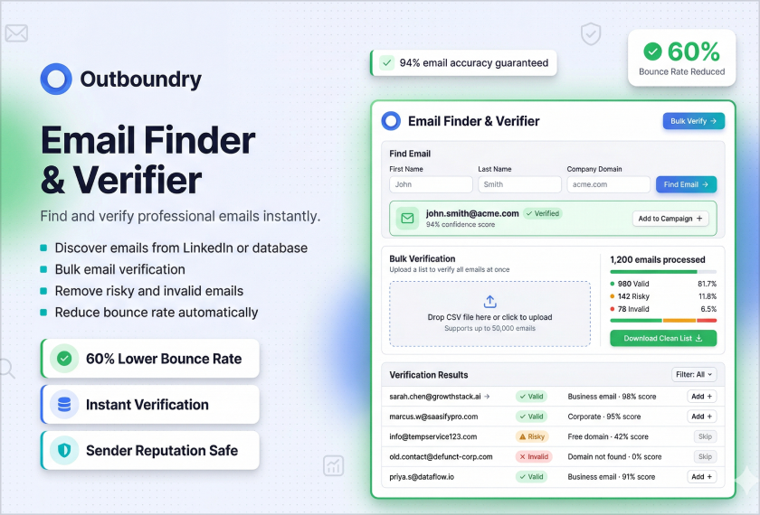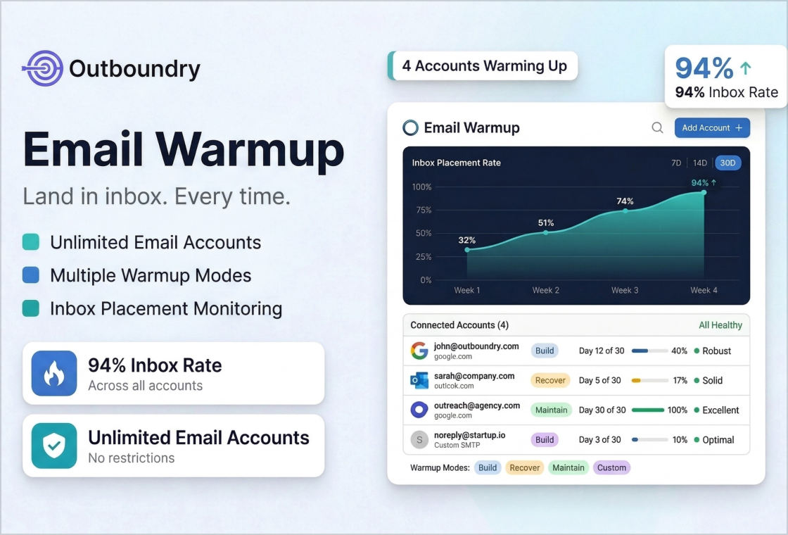 Outboundry combines LinkedIn outreach, email outreach, email warmup, inbox placement testing, email finder, and B2B lead database — all in one platform. No need to stack multiple tools.