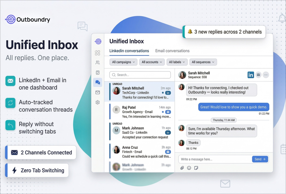 “We replaced three separate tools with Outboundry — LinkedIn automation, cold email, and warmup. Within the first month, our reply rate improved by 2x and managing outreach became much simpler.”